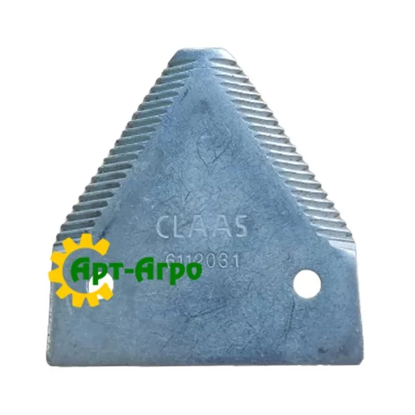 0006112031 - сегмент ножа жниварки для комбайнів Claas (Dominator, Mega, Lexion, Jaguar та ін). Трикутної форми з двома отворами кріплення, що підходить як для класичних, так і для дрейперних жниварок.
