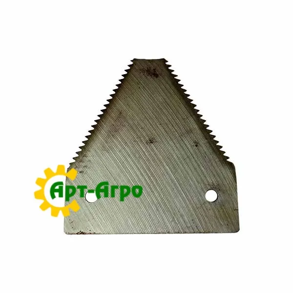 | Опис | Сегмент ножа жниварки — сталева пластина трапецієподібної форми з гострими зазубреними ріжучими кромками. Виготовляється з легованої загартованої сталі, що забезпечує високу зносостійкість і стійкість до зламу при інтенсивній роботі. Сегмент має кріпильні отвори біля основи та встановлюється на полотно ножа за допомогою заклепок або різьбового з’єднання. Забезпечує чистий зріз рослинної маси, стабільну роботу різального апарата та зменшення втрат під час збирання врожаю. Завдяки точній геометрії та стандартним посадковим отворам забезпечується щільна фіксація на ножі та стабільна робота різального апарата без вібрацій. |
