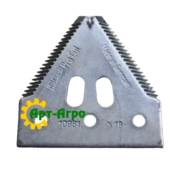 | Опис | Сегмент ножа жниварки — сталева пластина трапецієподібної форми з гострими зазубреними ріжучими кромками. Виготовляється з легованої загартованої сталі, що забезпечує високу зносостійкість і стійкість до зламу при інтенсивній роботі. Сегмент має кріпильні отвори біля основи та встановлюється на полотно ножа за допомогою заклепок або різьбового з’єднання. Забезпечує чистий зріз рослинної маси, стабільну роботу різального апарата та зменшення втрат під час збирання врожаю. Завдяки точній геометрії та стандартним посадковим отворам забезпечується щільна фіксація на ножі та стабільна робота різального апарата без вібрацій. |