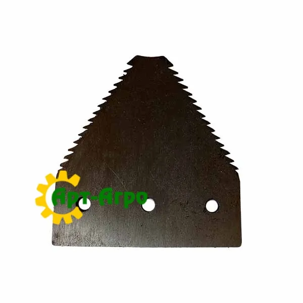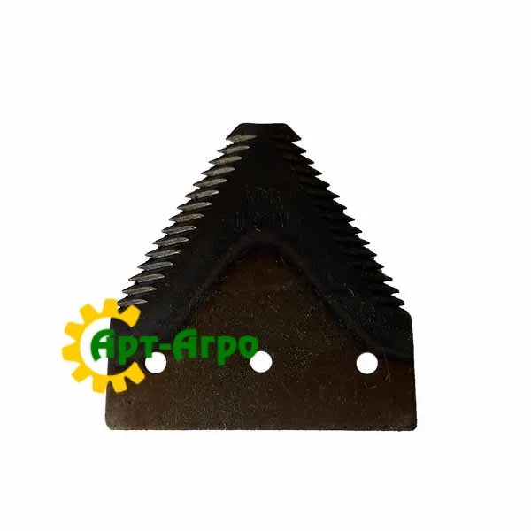 | Опис | Сегмент ножа жниварки — сталева пластина трапецієподібної форми з гострими зазубреними ріжучими кромками. Виготовляється з легованої загартованої сталі, що забезпечує високу зносостійкість і стійкість до зламу при інтенсивній роботі. Сегмент має кріпильні отвори біля основи та встановлюється на полотно ножа за допомогою заклепок або різьбового з’єднання. Забезпечує чистий зріз рослинної маси, стабільну роботу різального апарата та зменшення втрат під час збирання врожаю. Завдяки точній геометрії та стандартним посадковим отворам забезпечується щільна фіксація на ножі та стабільна робота різального апарата без вібрацій. |