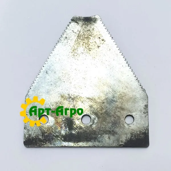 | Опис | Сегмент ножа жниварки — сталева пластина трапецієподібної форми з гострими зазубреними ріжучими кромками. Виготовляється з легованої загартованої сталі, що забезпечує високу зносостійкість і стійкість до зламу при інтенсивній роботі. Сегмент має кріпильні отвори біля основи та встановлюється на полотно ножа за допомогою заклепок або різьбового з’єднання. Забезпечує чистий зріз рослинної маси, стабільну роботу різального апарата та зменшення втрат під час збирання врожаю. Завдяки точній геометрії та стандартним посадковим отворам забезпечується щільна фіксація на ножі та стабільна робота різального апарата без вібрацій. |