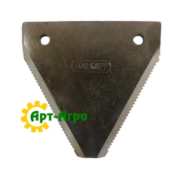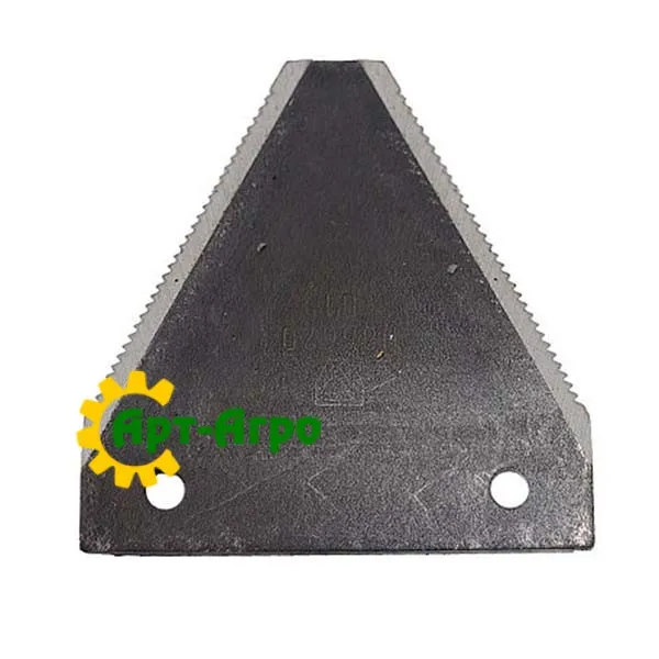 | Опис | Сегмент ножа жниварки — сталева пластина трапецієподібної форми з гострими зазубреними ріжучими кромками. Виготовляється з легованої загартованої сталі, що забезпечує високу зносостійкість і стійкість до зламу при інтенсивній роботі. Сегмент має кріпильні отвори біля основи та встановлюється на полотно ножа за допомогою заклепок або різьбового з’єднання. Забезпечує чистий зріз рослинної маси, стабільну роботу різального апарата та зменшення втрат під час збирання врожаю. Завдяки точній геометрії та стандартним посадковим отворам забезпечується щільна фіксація на ножі та стабільна робота різального апарата без вібрацій. |
