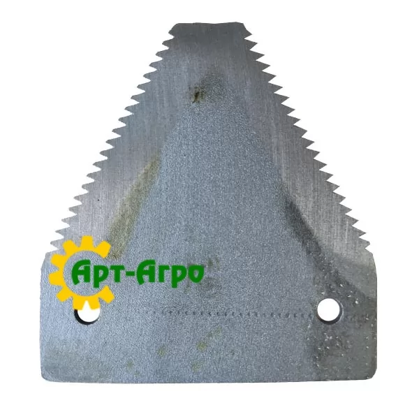 | Опис | Сегмент ножа жниварки — сталева пластина трапецієподібної форми з гострими зазубреними ріжучими кромками. Виготовляється з легованої загартованої сталі, що забезпечує високу зносостійкість і стійкість до зламу при інтенсивній роботі. Сегмент має кріпильні отвори біля основи та встановлюється на полотно ножа за допомогою заклепок або різьбового з’єднання. Забезпечує чистий зріз рослинної маси, стабільну роботу різального апарата та зменшення втрат під час збирання врожаю. Завдяки точній геометрії та стандартним посадковим отворам забезпечується щільна фіксація на ножі та стабільна робота різального апарата без вібрацій. |