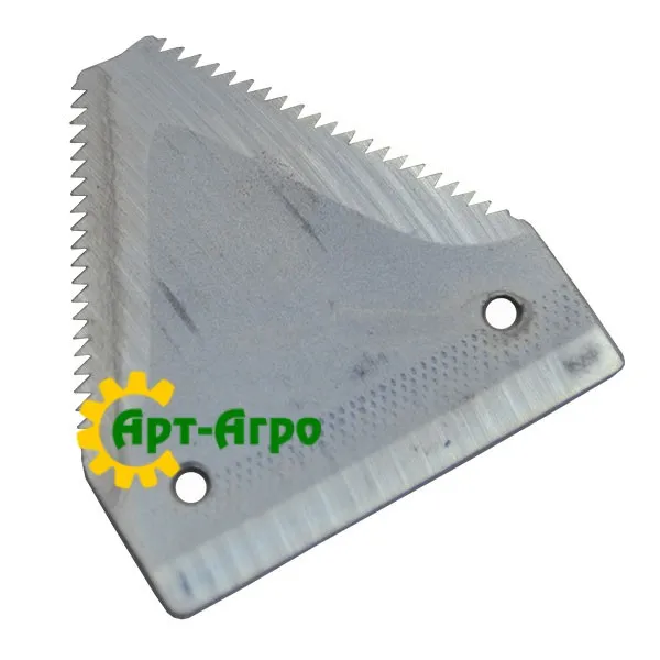 | Опис | Сегмент ножа жниварки — сталева пластина трапецієподібної форми з гострими зазубреними ріжучими кромками. Виготовляється з легованої загартованої сталі, що забезпечує високу зносостійкість і стійкість до зламу при інтенсивній роботі. Сегмент має кріпильні отвори біля основи та встановлюється на полотно ножа за допомогою заклепок або різьбового з’єднання. Забезпечує чистий зріз рослинної маси, стабільну роботу різального апарата та зменшення втрат під час збирання врожаю. Завдяки точній геометрії та стандартним посадковим отворам забезпечується щільна фіксація на ножі та стабільна робота різального апарата без вібрацій. |