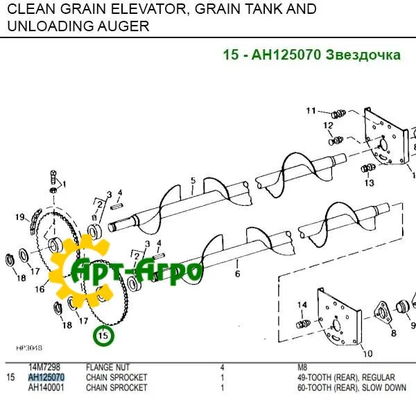 AH125070 Зірочка ланцюгова - один з обов'язкових елементів комбайна, призначена для ланцюгової передачі крутного моменту приводу елеватора або зернобункера. Ланцюг використовується AH157083 або AH157084.