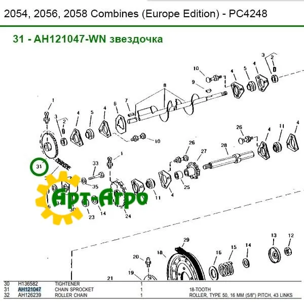 AH121047-WN (analogue) sprocket is one of the mandatory elements of the combine, designed for chain transmission of the elevator drive torque.