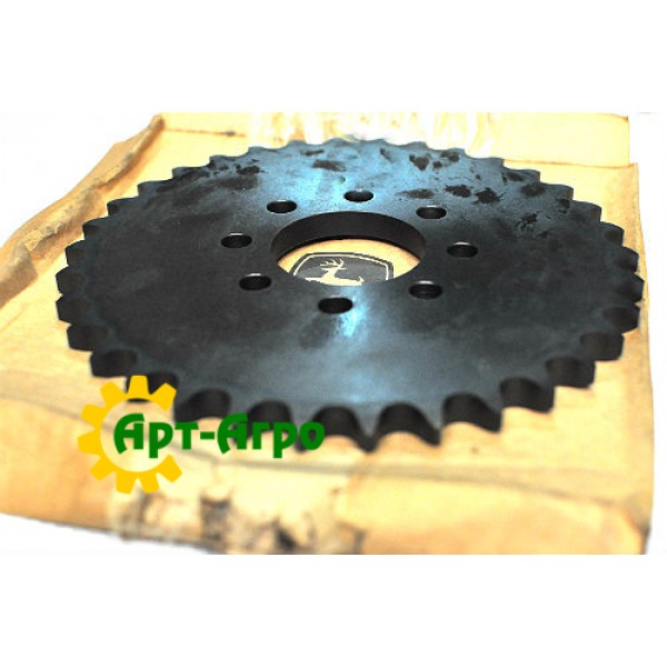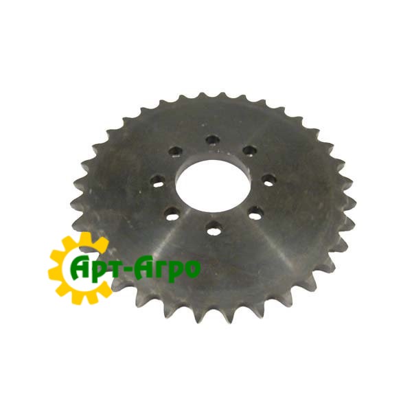 The H219634 is a chain sprocket that is installed in the feeder house drive mechanism of JohnDeere combine harvesters. It has 34 teeth and is designed to efficiently transmit torque to the chain that drives the grain conveyor from the header to the threshing unit.