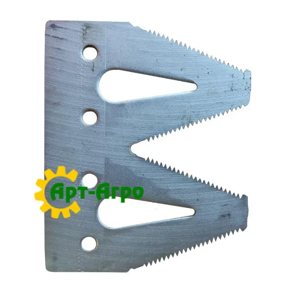 | Опис | Сегмент ножа жниварки — сталева пластина трапецієподібної форми з гострими зазубреними ріжучими кромками. Виготовляється з легованої загартованої сталі, що забезпечує високу зносостійкість і стійкість до зламу при інтенсивній роботі. Сегмент має кріпильні отвори біля основи та встановлюється на полотно ножа за допомогою заклепок або різьбового з’єднання. Забезпечує чистий зріз рослинної маси, стабільну роботу різального апарата та зменшення втрат під час збирання врожаю. Завдяки точній геометрії та стандартним посадковим отворам забезпечується щільна фіксація на ножі та стабільна робота різального апарата без вібрацій. |