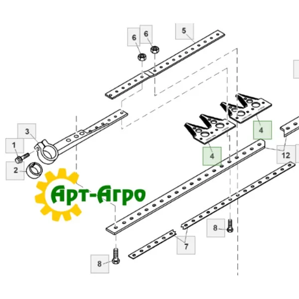 | Опис | Сегмент ножа жниварки — сталева пластина трапецієподібної форми з гострими зазубреними ріжучими кромками. Виготовляється з легованої загартованої сталі, що забезпечує високу зносостійкість і стійкість до зламу при інтенсивній роботі. Сегмент має кріпильні отвори біля основи та встановлюється на полотно ножа за допомогою заклепок або різьбового з’єднання. Забезпечує чистий зріз рослинної маси, стабільну роботу різального апарата та зменшення втрат під час збирання врожаю. Завдяки точній геометрії та стандартним посадковим отворам забезпечується щільна фіксація на ножі та стабільна робота різального апарата без вібрацій. |