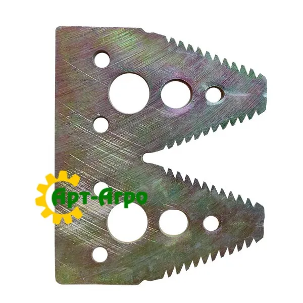 | Опис | Сегмент ножа жниварки — сталева пластина трапецієподібної форми з гострими зазубреними ріжучими кромками. Виготовляється з легованої загартованої сталі, що забезпечує високу зносостійкість і стійкість до зламу при інтенсивній роботі. Сегмент має кріпильні отвори біля основи та встановлюється на полотно ножа за допомогою заклепок або різьбового з’єднання. Забезпечує чистий зріз рослинної маси, стабільну роботу різального апарата та зменшення втрат під час збирання врожаю. Завдяки точній геометрії та стандартним посадковим отворам забезпечується щільна фіксація на ножі та стабільна робота різального апарата без вібрацій. |