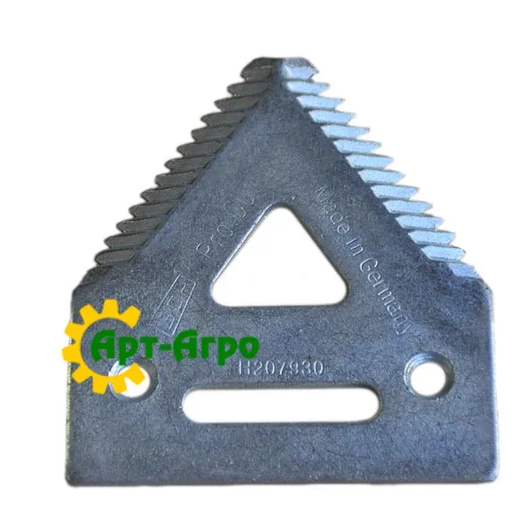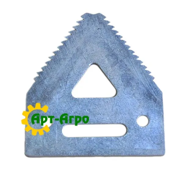 | Опис | Сегмент ножа жниварки — сталева пластина трапецієподібної форми з гострими зазубреними ріжучими кромками. Виготовляється з легованої загартованої сталі, що забезпечує високу зносостійкість і стійкість до зламу при інтенсивній роботі. Сегмент має кріпильні отвори біля основи та встановлюється на полотно ножа за допомогою заклепок або різьбового з’єднання. Забезпечує чистий зріз рослинної маси, стабільну роботу різального апарата та зменшення втрат під час збирання врожаю. Завдяки точній геометрії та стандартним посадковим отворам забезпечується щільна фіксація на ножі та стабільна робота різального апарата без вібрацій. |