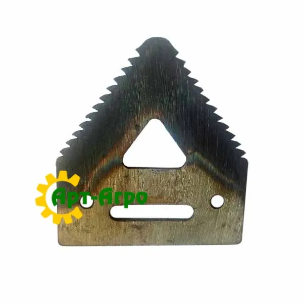 | Опис | Сегмент ножа жниварки — сталева пластина трапецієподібної форми з гострими зазубреними ріжучими кромками. Виготовляється з легованої загартованої сталі, що забезпечує високу зносостійкість і стійкість до зламу при інтенсивній роботі. Сегмент має кріпильні отвори біля основи та встановлюється на полотно ножа за допомогою заклепок або різьбового з’єднання. Забезпечує чистий зріз рослинної маси, стабільну роботу різального апарата та зменшення втрат під час збирання врожаю. Завдяки точній геометрії та стандартним посадковим отворам забезпечується щільна фіксація на ножі та стабільна робота різального апарата без вібрацій. |