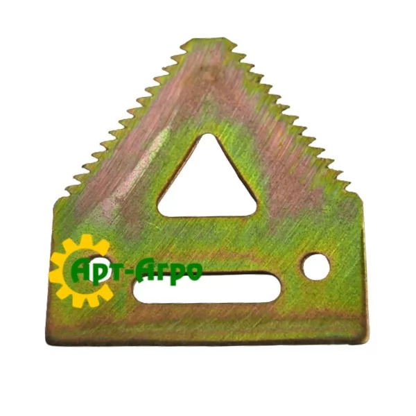 | Опис | Сегмент ножа жниварки — сталева пластина трапецієподібної форми з гострими зазубреними ріжучими кромками. Виготовляється з легованої загартованої сталі, що забезпечує високу зносостійкість і стійкість до зламу при інтенсивній роботі. Сегмент має кріпильні отвори біля основи та встановлюється на полотно ножа за допомогою заклепок або різьбового з’єднання. Забезпечує чистий зріз рослинної маси, стабільну роботу різального апарата та зменшення втрат під час збирання врожаю. Завдяки точній геометрії та стандартним посадковим отворам забезпечується щільна фіксація на ножі та стабільна робота різального апарата без вібрацій. |