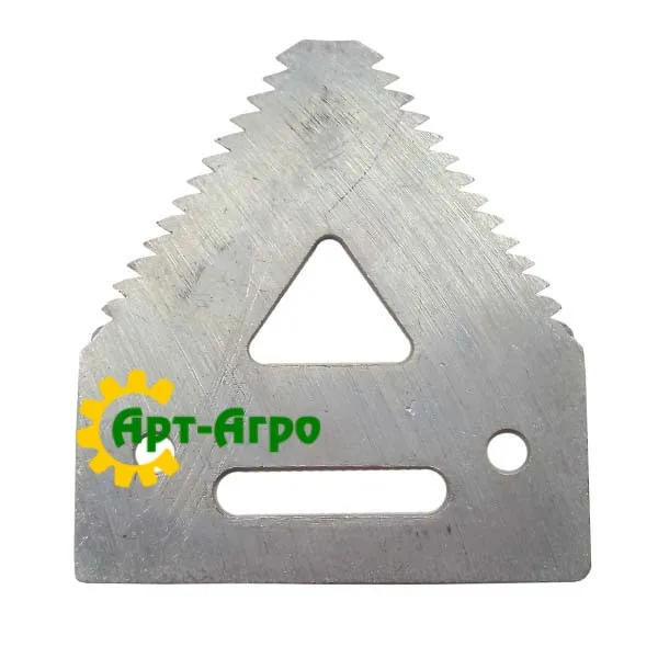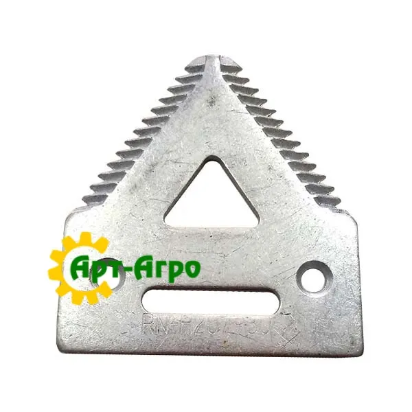 | Опис | Сегмент ножа жниварки — сталева пластина трапецієподібної форми з гострими зазубреними ріжучими кромками. Виготовляється з легованої загартованої сталі, що забезпечує високу зносостійкість і стійкість до зламу при інтенсивній роботі. Сегмент має кріпильні отвори біля основи та встановлюється на полотно ножа за допомогою заклепок або різьбового з’єднання. Забезпечує чистий зріз рослинної маси, стабільну роботу різального апарата та зменшення втрат під час збирання врожаю. Завдяки точній геометрії та стандартним посадковим отворам забезпечується щільна фіксація на ножі та стабільна робота різального апарата без вібрацій. |