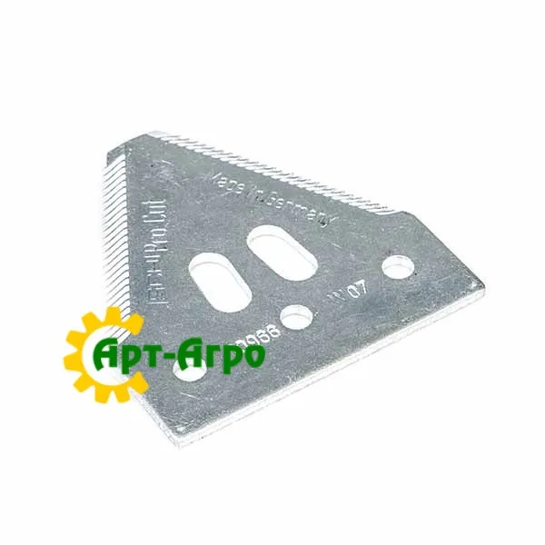 | Опис | Сегмент ножа жниварки — сталева пластина трапецієподібної форми з гострими зазубреними ріжучими кромками. Виготовляється з легованої загартованої сталі, що забезпечує високу зносостійкість і стійкість до зламу при інтенсивній роботі. Сегмент має кріпильні отвори біля основи та встановлюється на полотно ножа за допомогою заклепок або різьбового з’єднання. Забезпечує чистий зріз рослинної маси, стабільну роботу різального апарата та зменшення втрат під час збирання врожаю. Завдяки точній геометрії та стандартним посадковим отворам забезпечується щільна фіксація на ножі та стабільна робота різального апарата без вібрацій. |