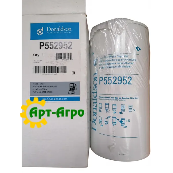 Деталь P552952 — це фільтр-сепаратор палива типу spin-on з функцією відділення води (water separator). Він встановлюється у паливну систему, де виконує дві функції: фільтрує тверді частинки і відділяє воду з палива, що дуже важливо для захисту двигуна від корозії та засмічення.