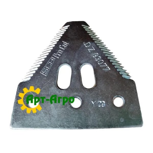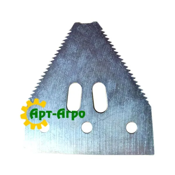 | Опис | Сегмент ножа жниварки — сталева пластина трапецієподібної форми з гострими зазубреними ріжучими кромками. Виготовляється з легованої загартованої сталі, що забезпечує високу зносостійкість і стійкість до зламу при інтенсивній роботі. Сегмент має кріпильні отвори біля основи та встановлюється на полотно ножа за допомогою заклепок або різьбового з’єднання. Забезпечує чистий зріз рослинної маси, стабільну роботу різального апарата та зменшення втрат під час збирання врожаю. Завдяки точній геометрії та стандартним посадковим отворам забезпечується щільна фіксація на ножі та стабільна робота різального апарата без вібрацій. |