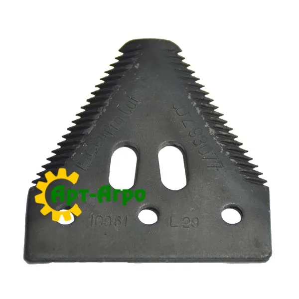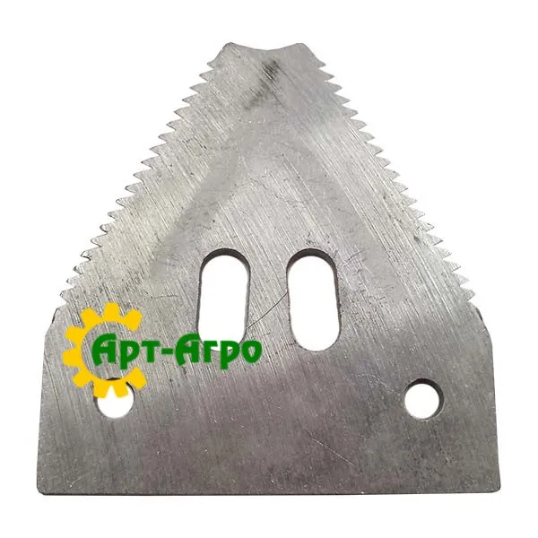 | Опис | Сегмент ножа жниварки — сталева пластина трапецієподібної форми з гострими зазубреними ріжучими кромками. Виготовляється з легованої загартованої сталі, що забезпечує високу зносостійкість і стійкість до зламу при інтенсивній роботі. Сегмент має кріпильні отвори біля основи та встановлюється на полотно ножа за допомогою заклепок або різьбового з’єднання. Забезпечує чистий зріз рослинної маси, стабільну роботу різального апарата та зменшення втрат під час збирання врожаю. Завдяки точній геометрії та стандартним посадковим отворам забезпечується щільна фіксація на ножі та стабільна робота різального апарата без вібрацій. |